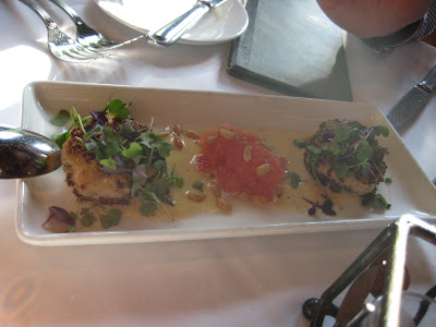 So about a year ago when I was going through the hell that is known as "med school applications", I made a bet with my parents. If a med school accepted me they had to take me out to dinner to the bestest place ever...Log Haven. Well I was accepted to two med schools so they had to shell out some extra dough..hehe! And since I am obsessed with food I of course have to give a description: I started out with a yummy sweet wine-rose cocktail, then we had grilled calamari (totally out of this world), and quinoa encrusted crab cakes. Britta and I shared a half bottle of champagne for the appetizer/salad course. My salad was heirloom lettuce, egg, truffle vinaigrette, and mushroom. We ordered my favorite wine, a Gruner, for our entrees. I had a bison ribeye with parmesan pomme fritte. Britta had grilled scallops atop creamy risotto with a carrot coulis. For dessert, coffee, creme brulee, and a triple chocolate cake thing that was blow-you-away fantastic.